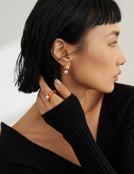 This Sterling Silver Natural Pearl Ring masterfully blends fluid contours with geometric square structures, creating a striking contrast between soft, organic movement and rigid architectural form. The asymmetrical liquid-like texture wraps around the square frame, giving the piece a contemporary and avant-garde appeal. A single natural freshwater pearl delicately adorns the design, adding a touch of elegance and sophistication.