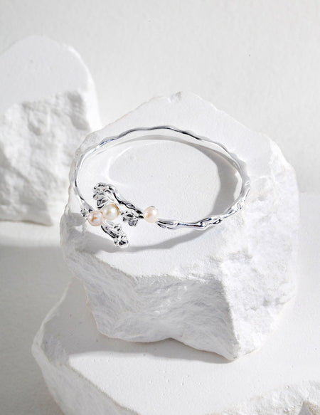 This Sterling Silver Pearl Bracelet captures the essence of ocean waves gently rising and falling, with delicate pearls set like moonlight reflecting on the sea. Designed to embody fluid movement and tranquility, the bracelet’s sculptural form mimics the organic beauty of rolling tides, creating a piece that is both bold and graceful.
