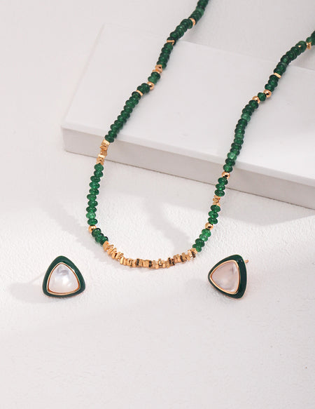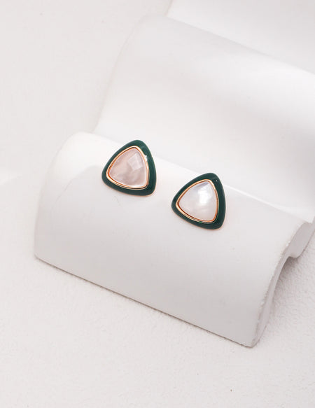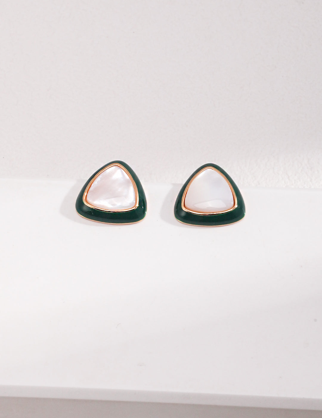 These Sterling Silver Earrings capture the essence of French elegance, featuring a modern triangular design with a rich emerald-green enamel frame, perfectly complementing the iridescent glow of mother-of-pearl inlays. The vintage gold-tone detailing adds a sophisticated contrast, making these earrings a chic and versatile addition to any jewelry collection.