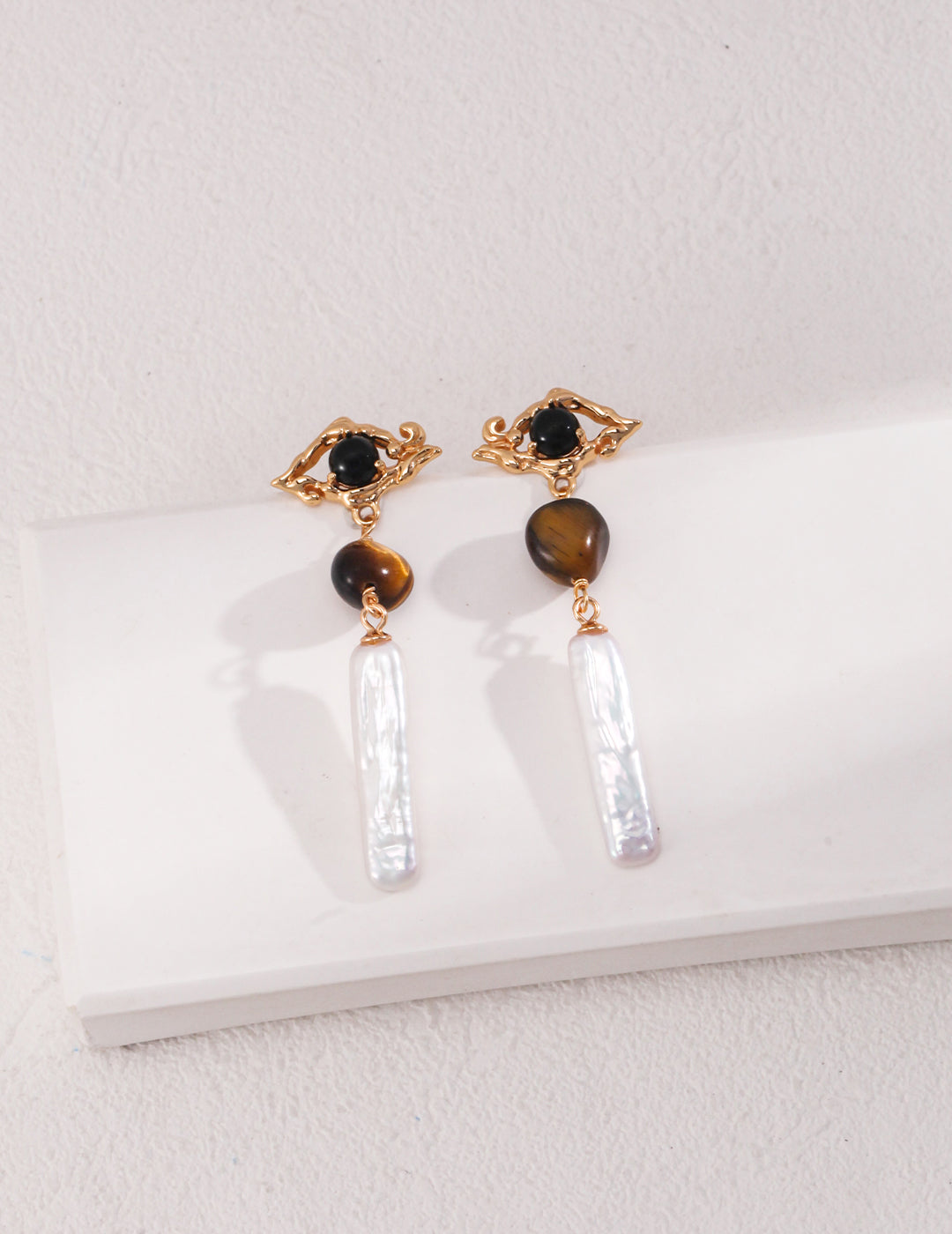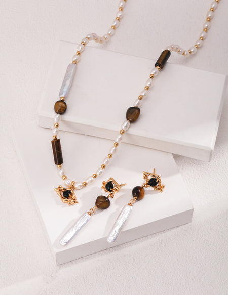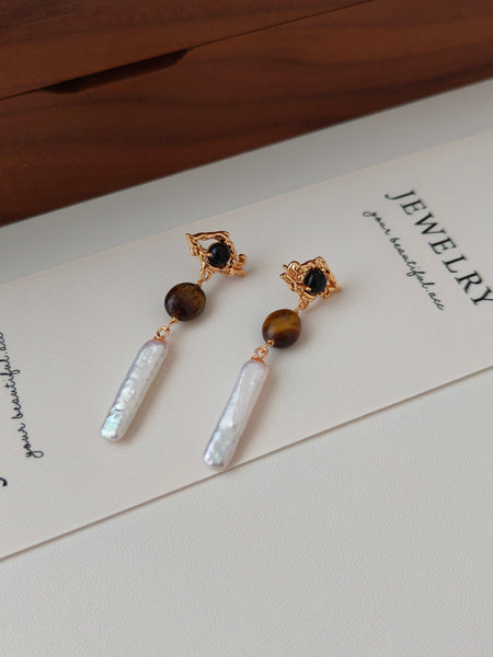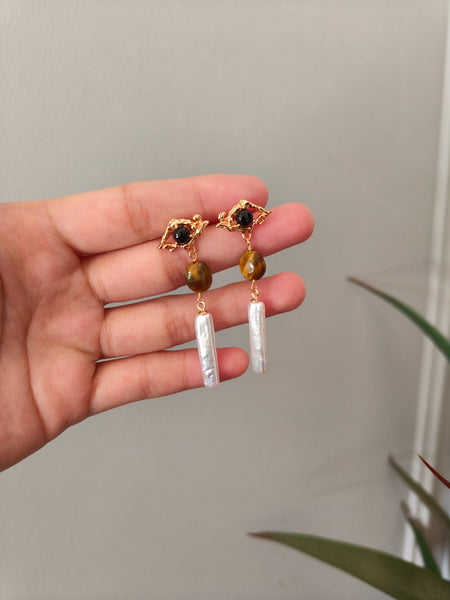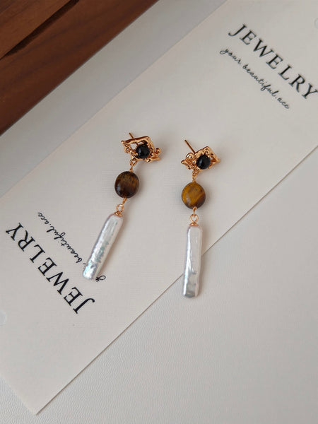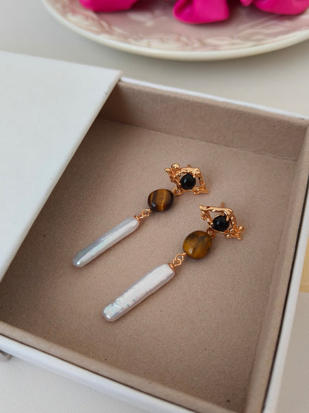 These Sterling Silver Drop Earrings feature a harmonious combination of Baroque-inspired textures, tiger’s eye, black onyx, and freshwater pearls, creating an artistic and refined design. The gold-plated irregular metalwork embraces the contrasting gemstones, leading to an elongated pearl drop, which adds a touch of movement and sophistication.