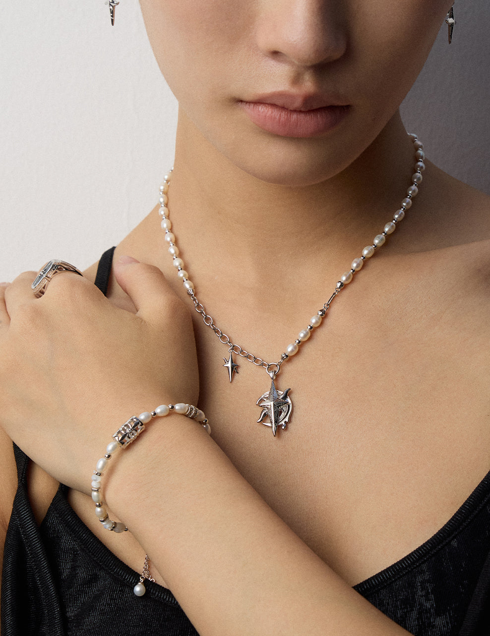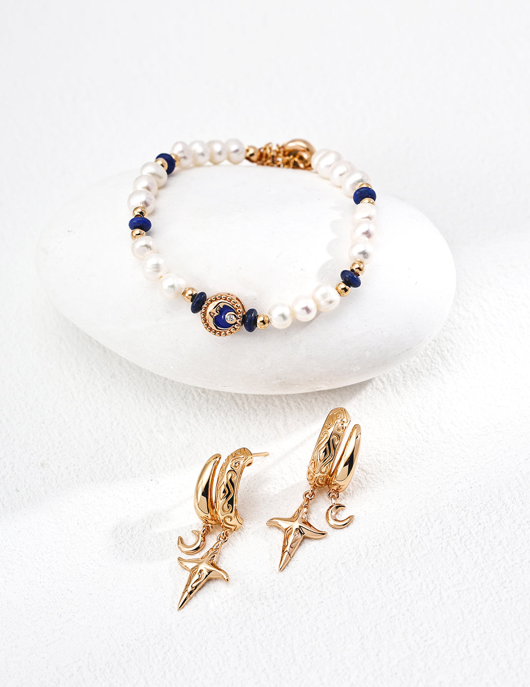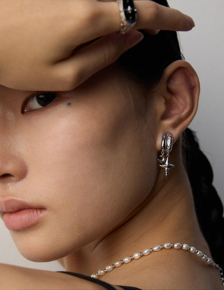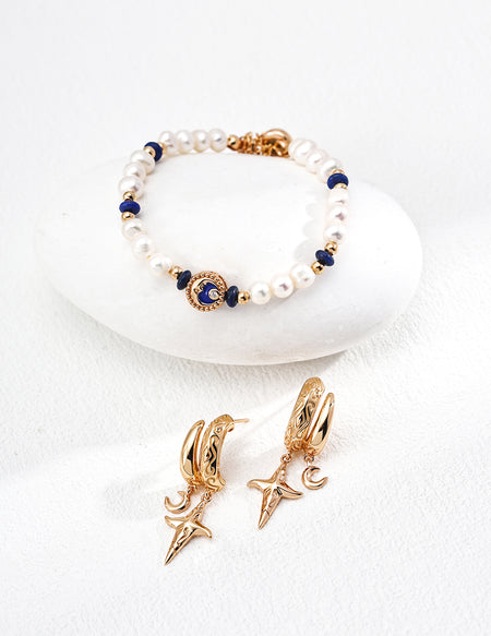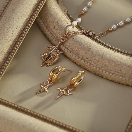 Crafted from S925 sterling silver and natural freshwater pearls, this set includes a shimmering necklace adorned with asymmetrical star and moon charms, and a pair of delicate drop earrings that echo the same galactic rhythm.