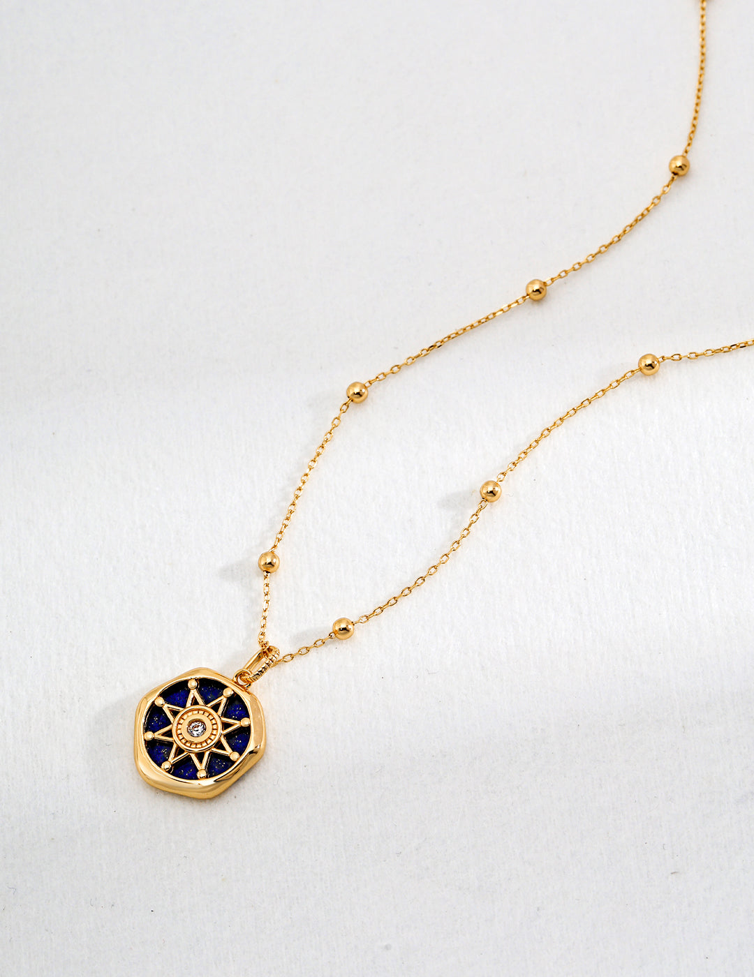 Embrace a journey of timeless sophistication with the S925 Silver Lapis Lazuli & Zircon Compass Pendant Necklace. Designed with a striking octagonal antique gold-plated frame, this necklace features a deep blue lapis lazuli inlay, symbolizing wisdom and strength. At the center, a delicate zircon-embellished compass design radiates a sense of direction, making it a perfect statement piece for those who seek adventure and elegance.