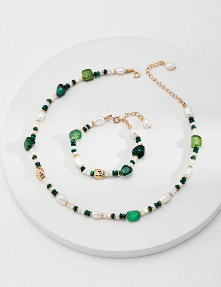 This stunning pearl and gemstone jewelry set is designed for those who love a touch of exotic elegance. Featuring natural freshwater pearls, vibrant malachite, and mother of pearl accents, this set creates a unique and artistic look that is both luxurious and effortlessly chic.