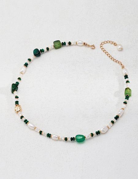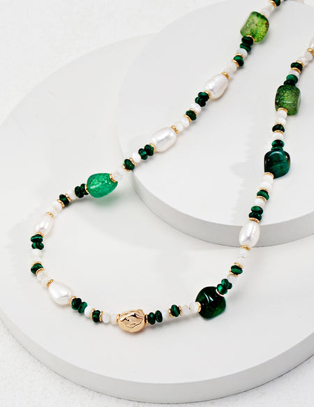 ✔ Adjustable Pearl & Malachite Necklace – A stunning mix of pearls, malachite, and textured gold beads