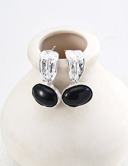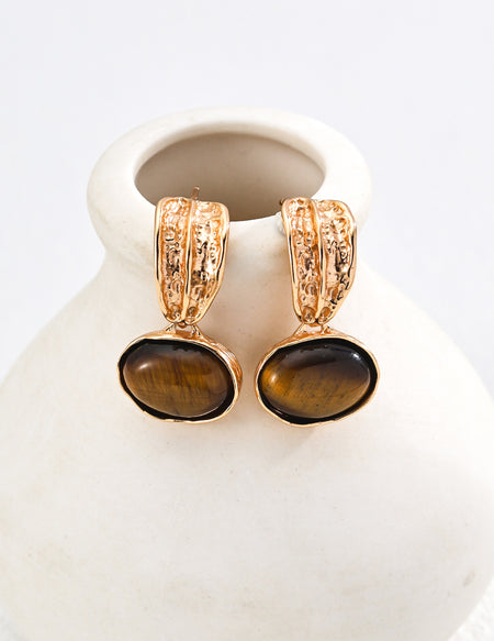 Elevate your style with the Fierce Elegance Earrings, a bold blend of mystery and warmth. These statement earrings feature natural black agate and tiger eye stones, set in delicately textured antique gold or white gold plated S925 sterling silver.