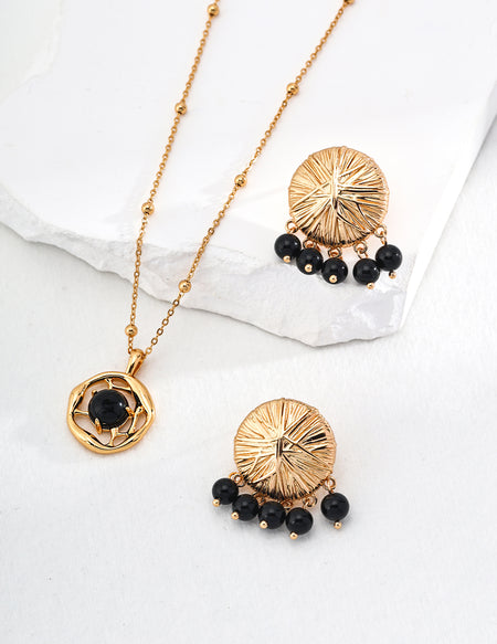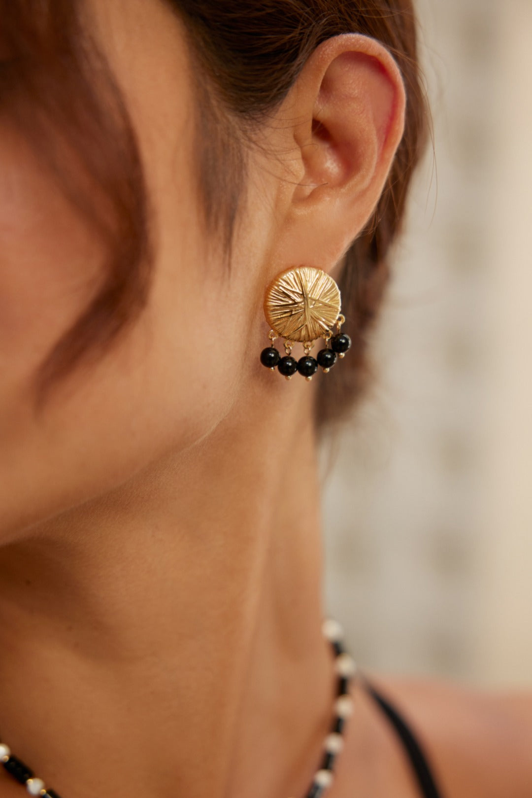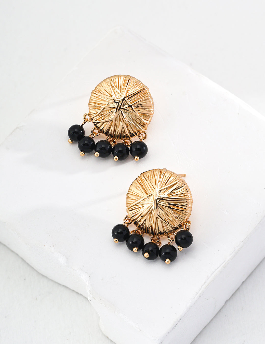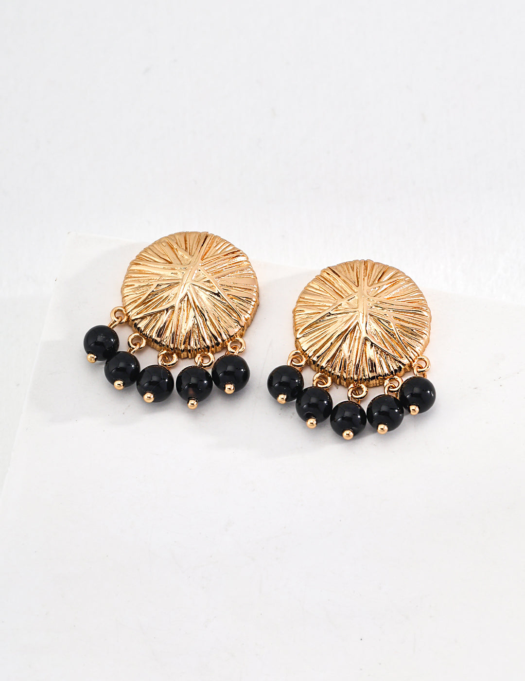 The Golden Escape Earrings feature a striking combination of natural black agate beads and a textured vintage gold disc, capturing the effortless charm of European summer style.