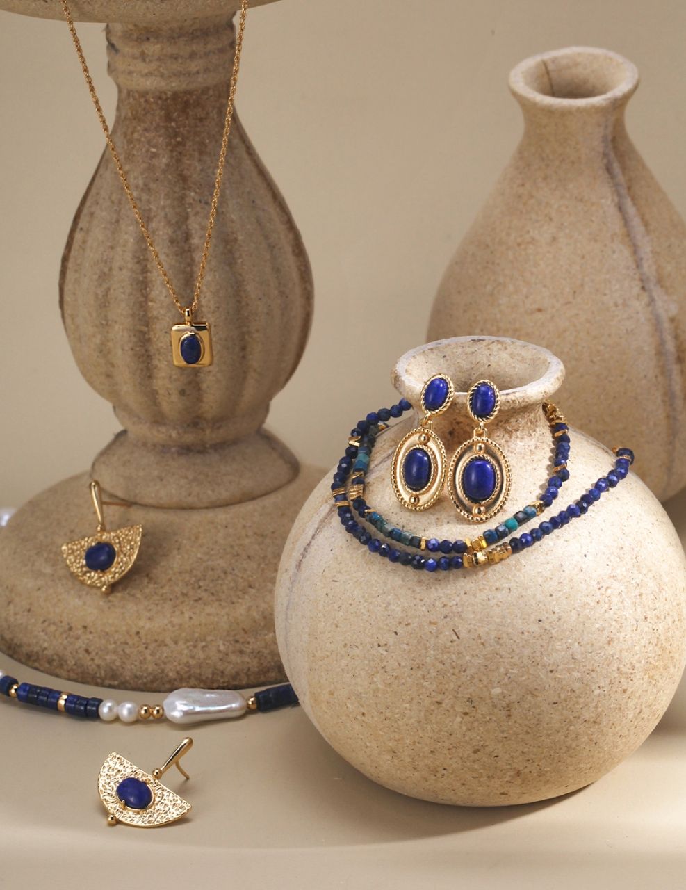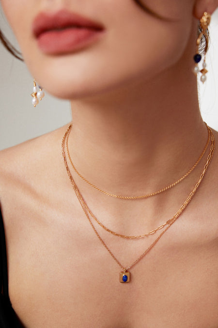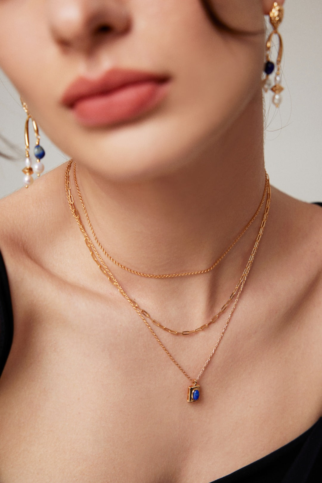 Elevate your layering game with the Layered Elegance Necklace — a refined combination of vintage-inspired textures and subtle gemstone shimmer. Crafted from premium 925 sterling silver and finished in a rich antique gold tone, this piece features multiple delicate chains accented with natural lapis lazuli, known for its deep blue hue and timeless beauty.