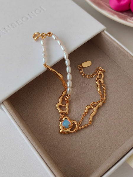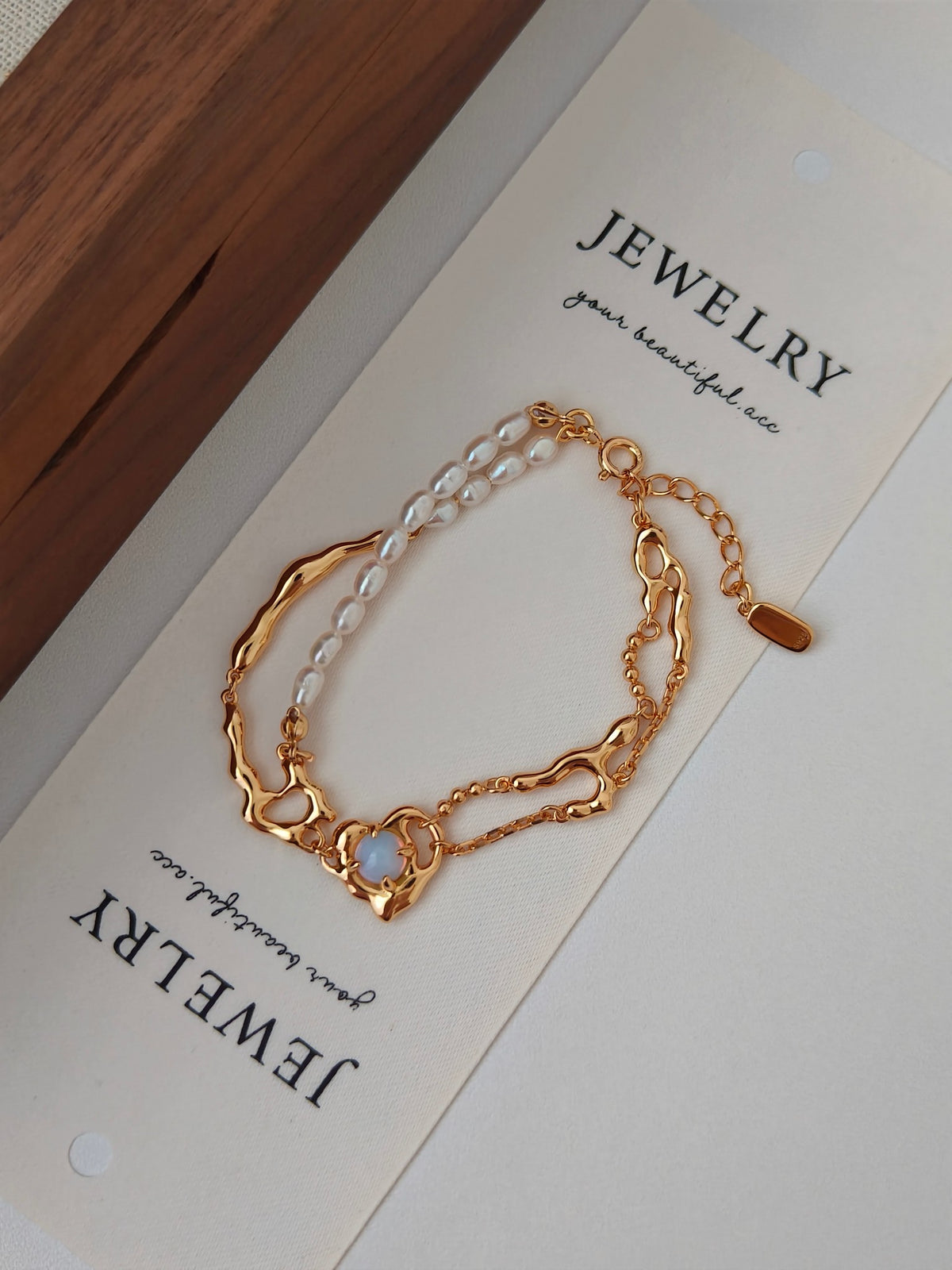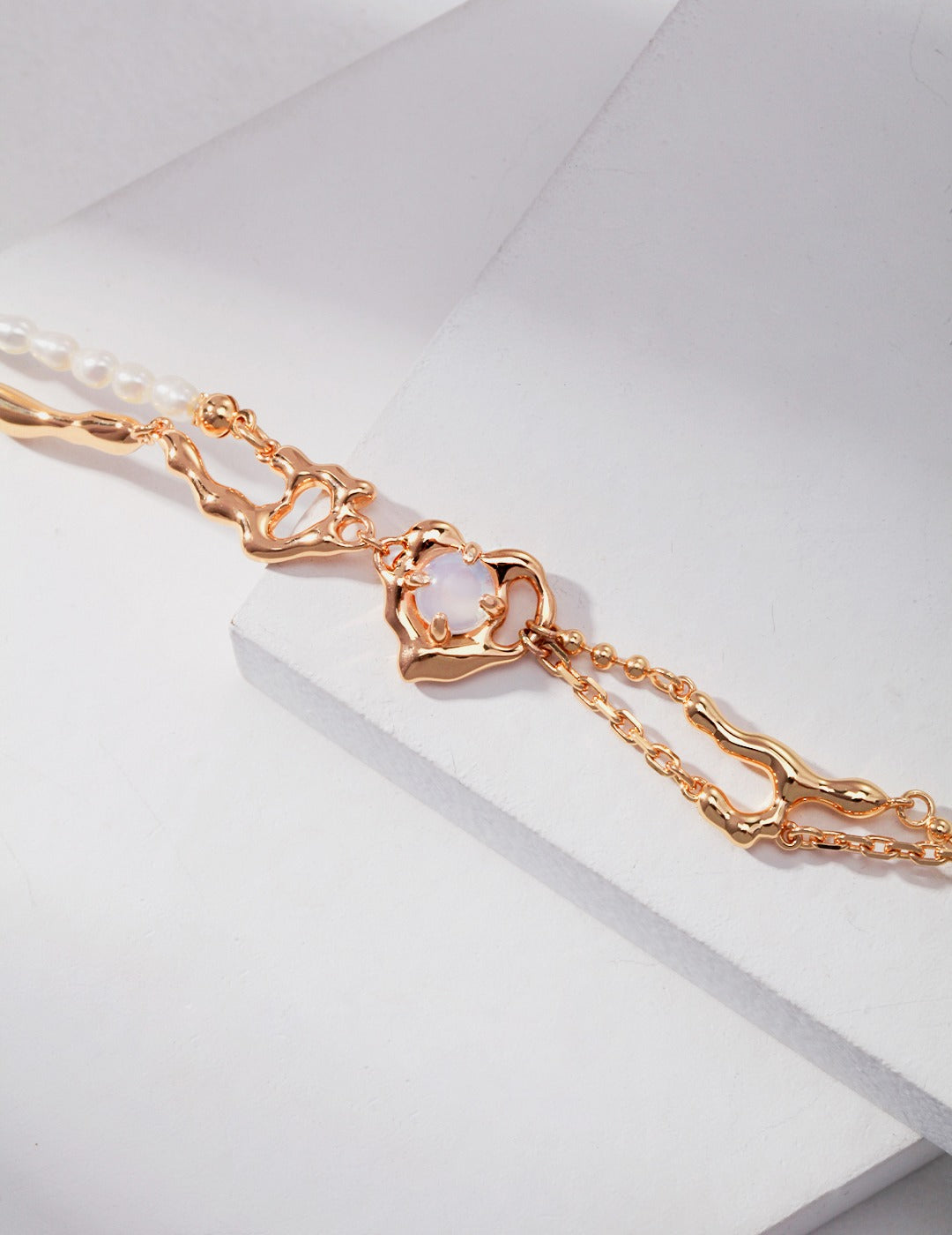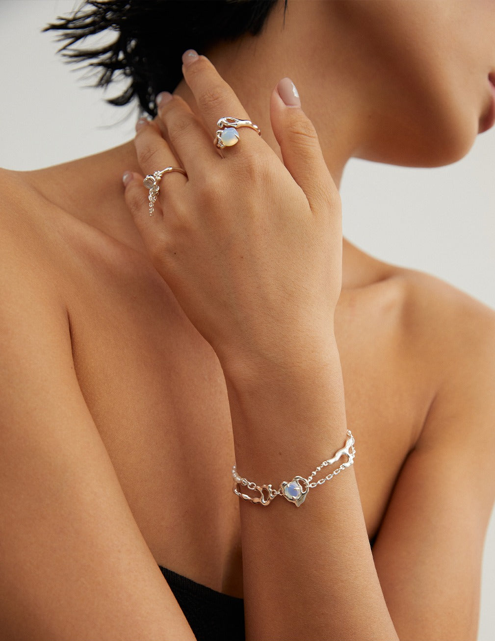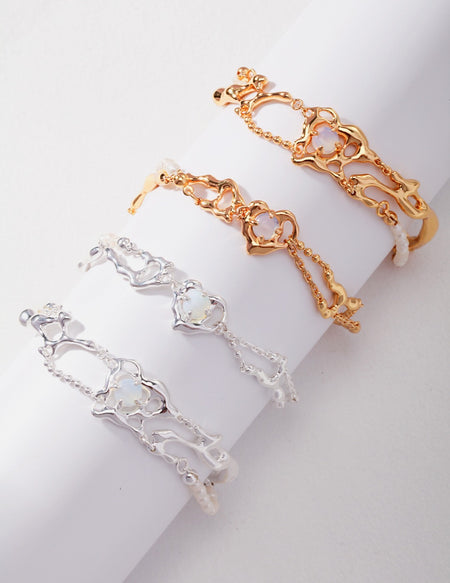The Liquid Love Bracelet blends natural textures and romantic elements into a flowing form. Crafted from S925 sterling silver, this bracelet features delicate white freshwater pearls, shimmering opal accents, and multi-link chain segments inspired by modern art.