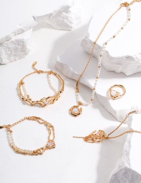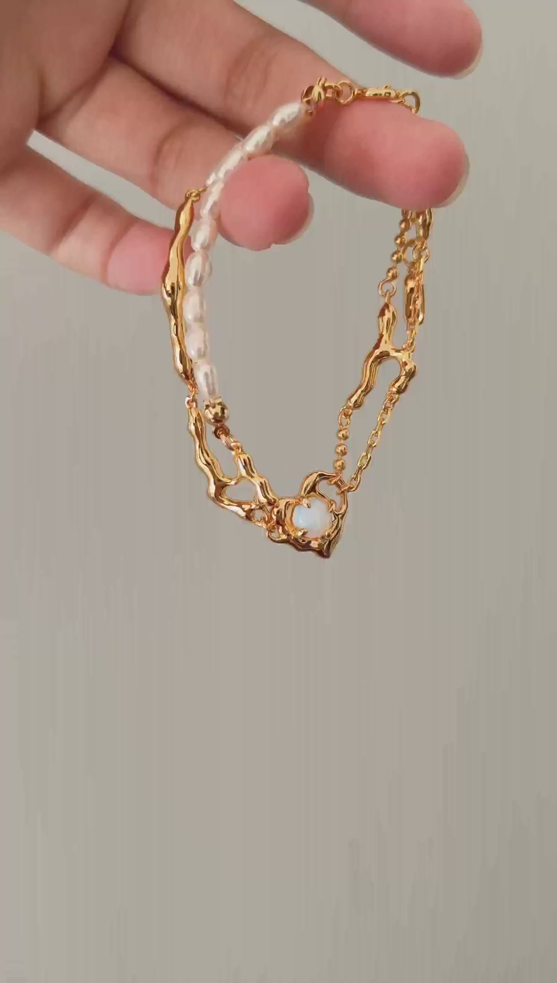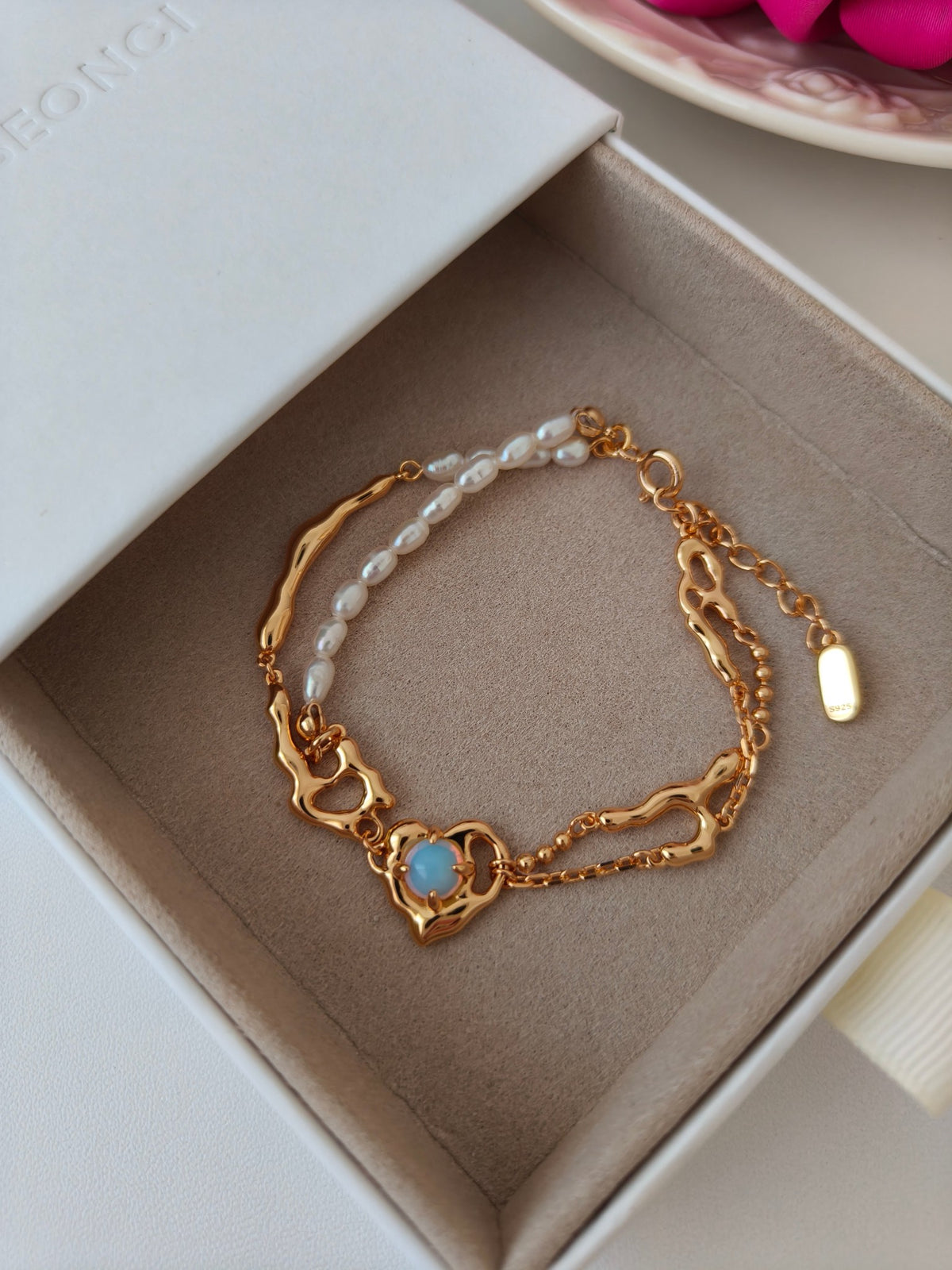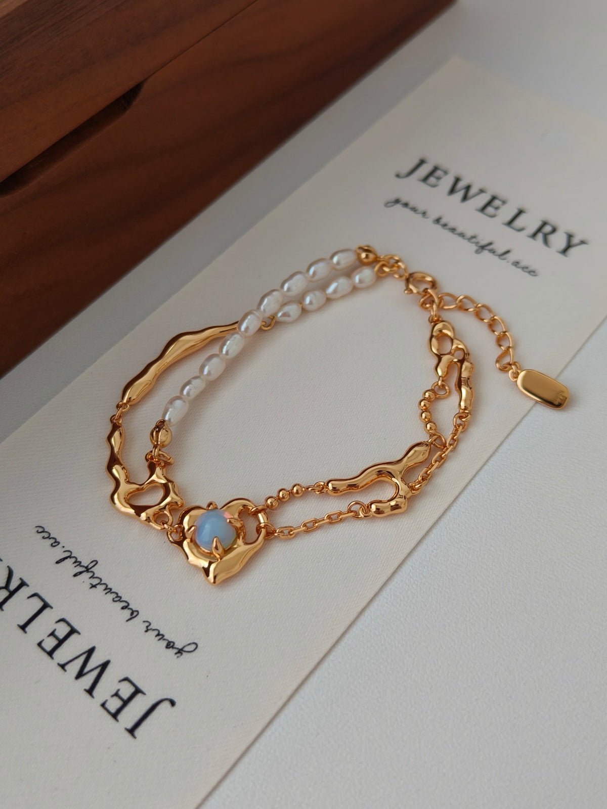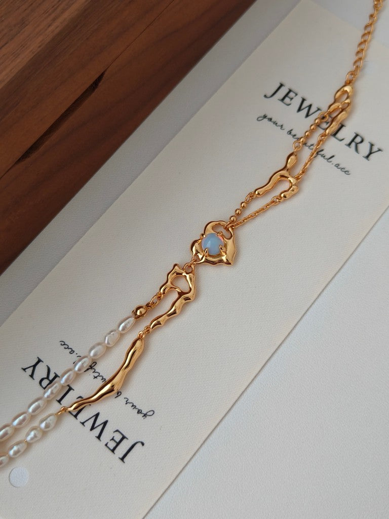 The Liquid Love Bracelet blends natural textures and romantic elements into a flowing form. Crafted from S925 sterling silver, this bracelet features delicate white freshwater pearls, shimmering opal accents, and multi-link chain segments inspired by modern art.