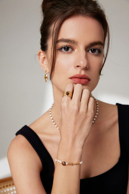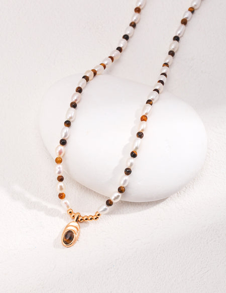 Featuring a mix of smooth freshwater pearls and rich tiger eye stones, this piece captures the color palette of sun-drenched landscapes.