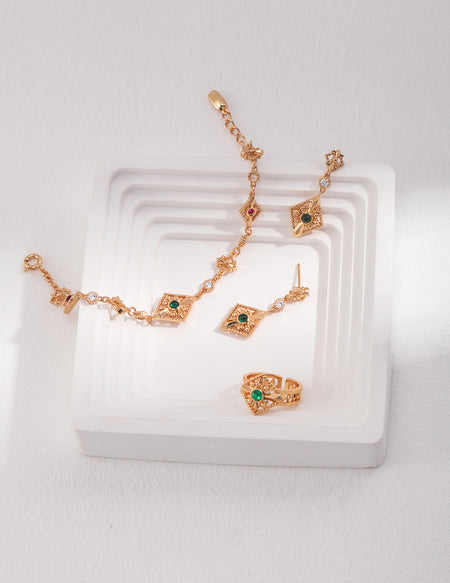 Crafted with intricate filigree patterns and set with a luminous cubic zirconia stone, each piece radiates a sense of exotic elegance.