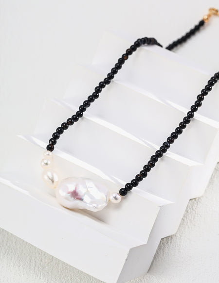 Featuring dainty black agate beads paired with a striking baroque pearl centerpiece, this necklace brings a sense of sophisticated contrast and depth.