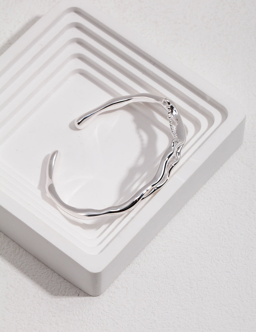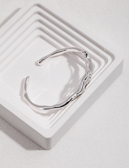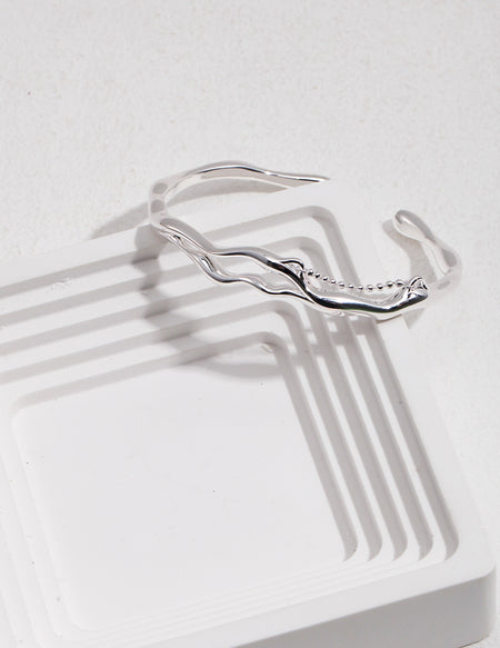 Inspired by the quiet strength of nature, this handcrafted bangle and double-ring set embodies the imperfect beauty of organic design. The freeform curves mirror flowing water, while the unpolished finish reflects an understated elegance. Subtle silver bead detailing adds a refined accent to the bold structure.