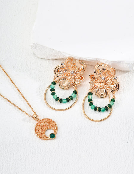 Elevate your jewelry collection with these stunning S925 Vintage Floral Green Gemstone Hoop Earrings, designed to exude timeless elegance and sophistication. Featuring an intricate floral motif with a shimmering gold-tone finish, these earrings are adorned with green gemstones and malachite beads, symbolizing vitality and prosperity.