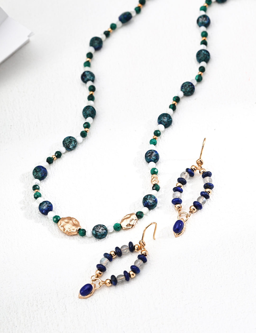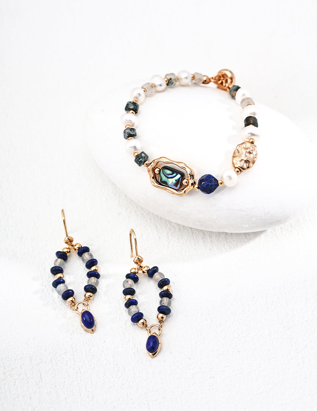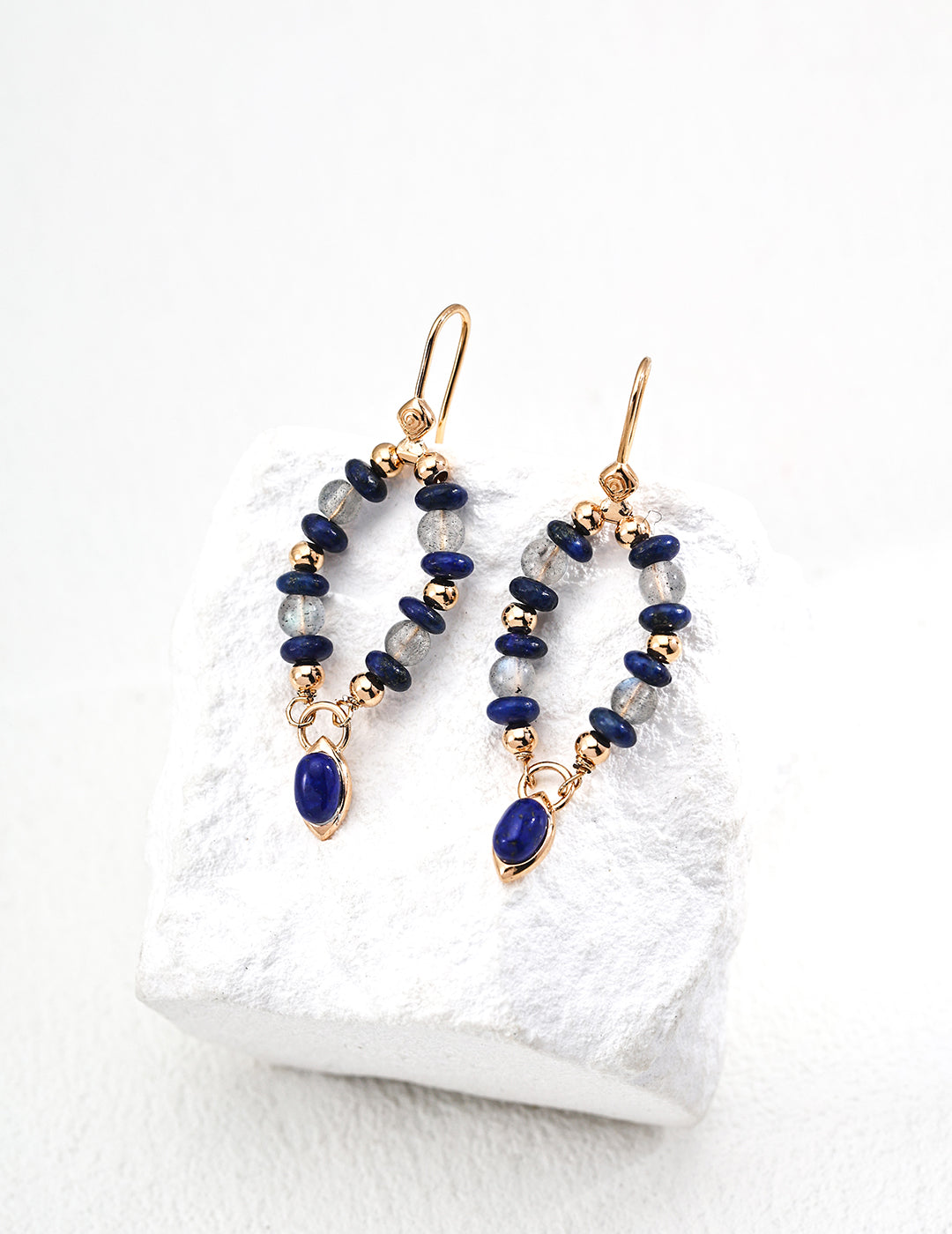 These S925 sterling silver earrings feature an elongated vintage teardrop shape, hand-strung with soft moonstone beads and deep indigo lapis lazuli accents. The asymmetrical arrangement and textured vintage gold finish lend an artisanal and mystical touch.