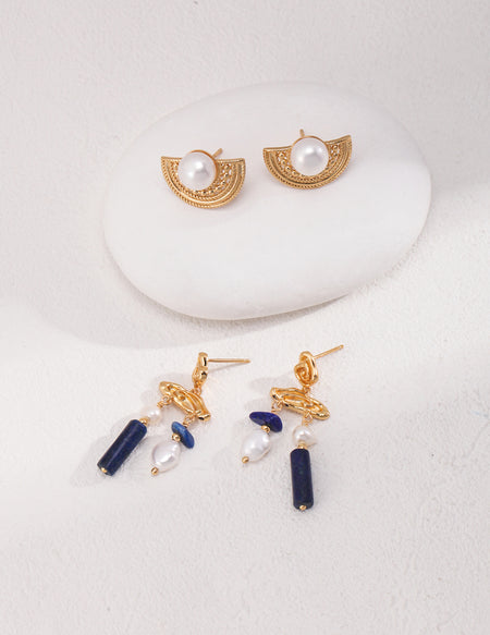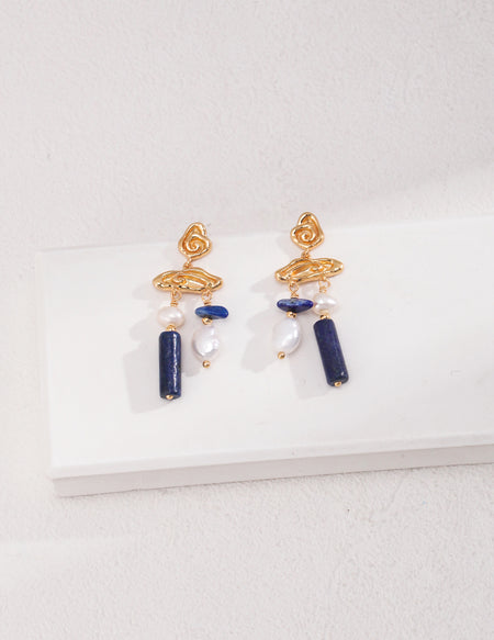 A fusion of classic luxury and modern artistry, these Abstract Lapis Lazuli & Pearl Earrings evoke a sense of timeless sophistication. Featuring deep blue lapis lazuli, a gemstone revered for centuries, paired with lustrous natural pearls, this design embodies both vintage refinement and contemporary creativity. The antique gold-plated detailing adds a touch of artistic abstraction, making these earrings a perfect statement piece for any occasion.