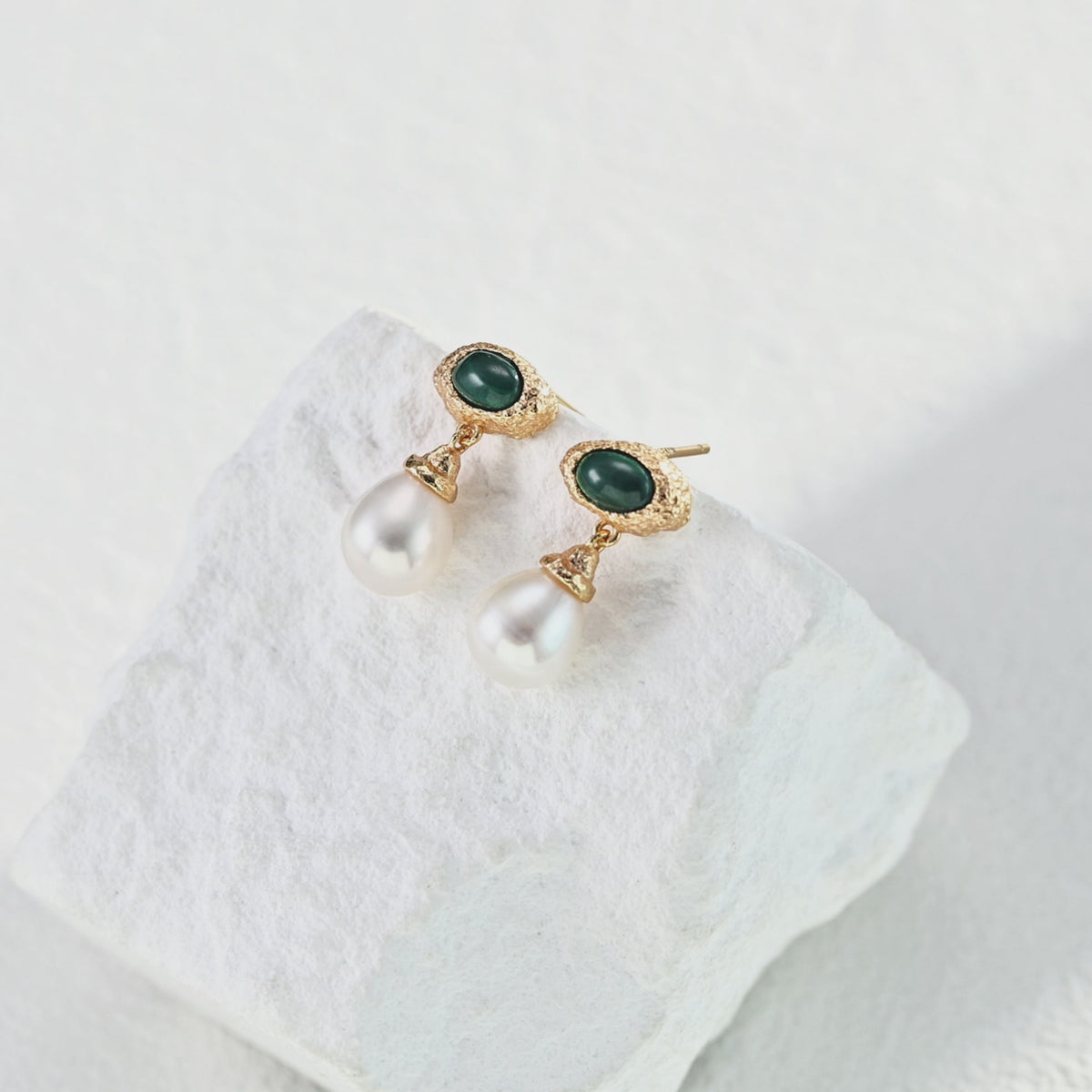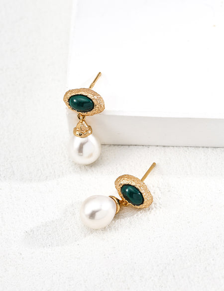 Graceful and grounded — the Verdant Drop Earrings pair luminous natural pearls with rich green malachite, finished in vintage gold for a refined yet organic touch.
